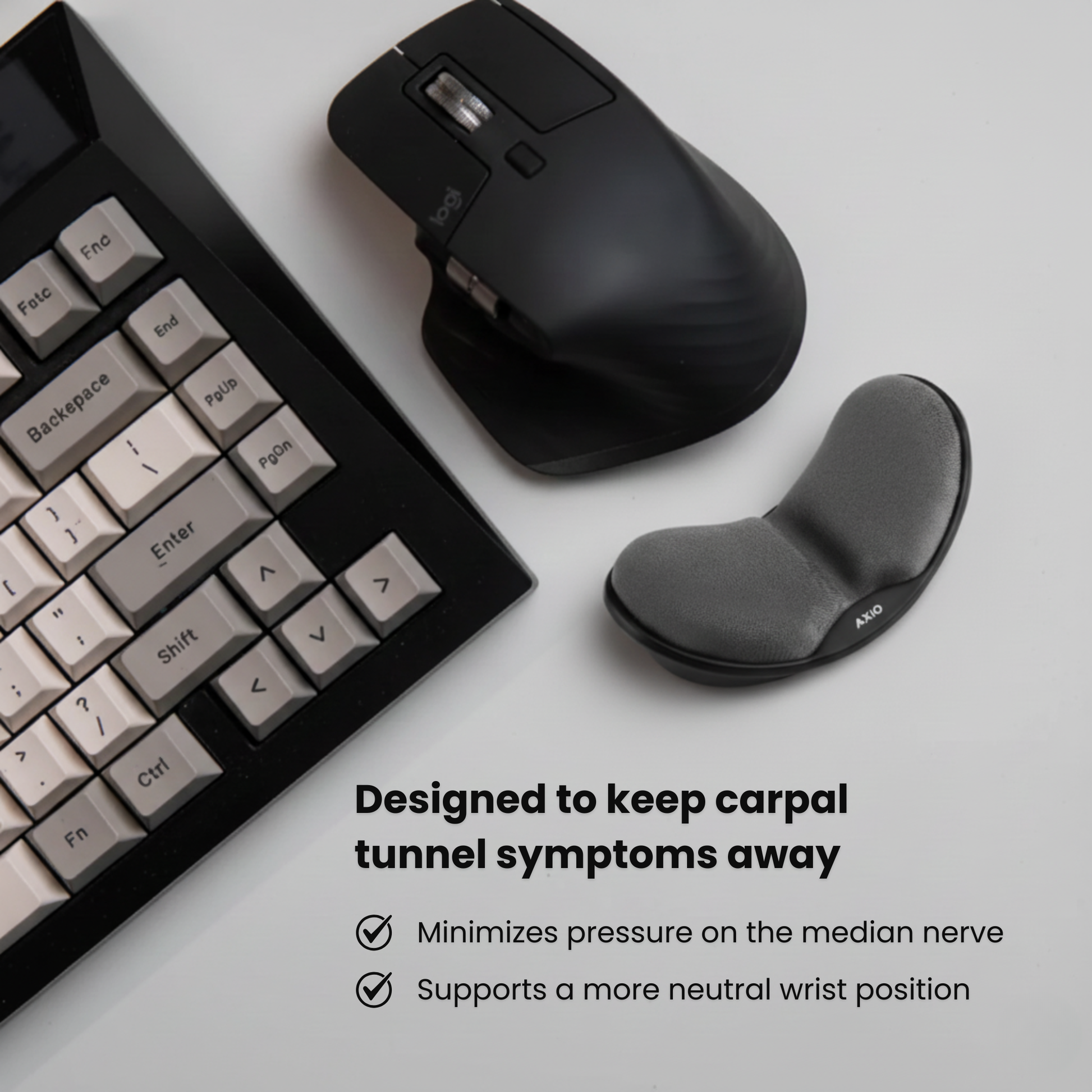 AXIO Flex was developed through extensive ergonomic research, anatomical studies of wrist mechanics, and guidance from medical professionals familiar with carpal tunnel syndrome. Dozens of prototypes and hand mold iterations helped us refine the exact shape that reduces median nerve pressure without adding bulk.